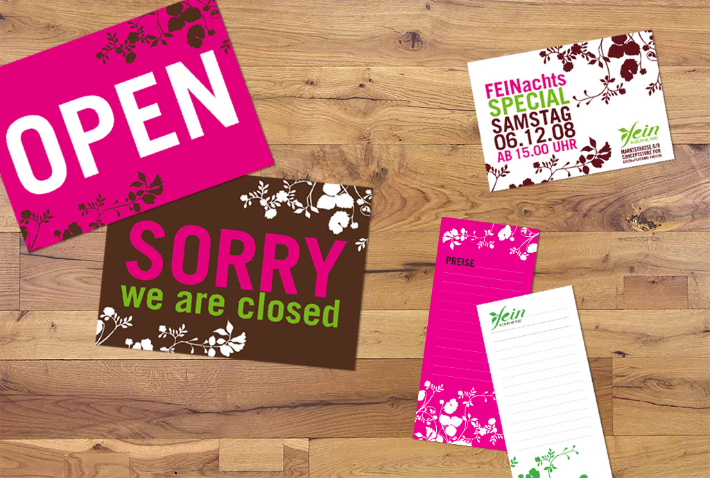 Illustration, Corporate Identity, Store-Dekoration — Ich entwickelte für "FEIN" (Concepstore for Green + Fairtrade Fashion) ein passendes CI. Jung, grün und fair ;-). Es war einer der ersten Stores dieser Art im Karoviertel in Hamburg. — Hamburg 2008